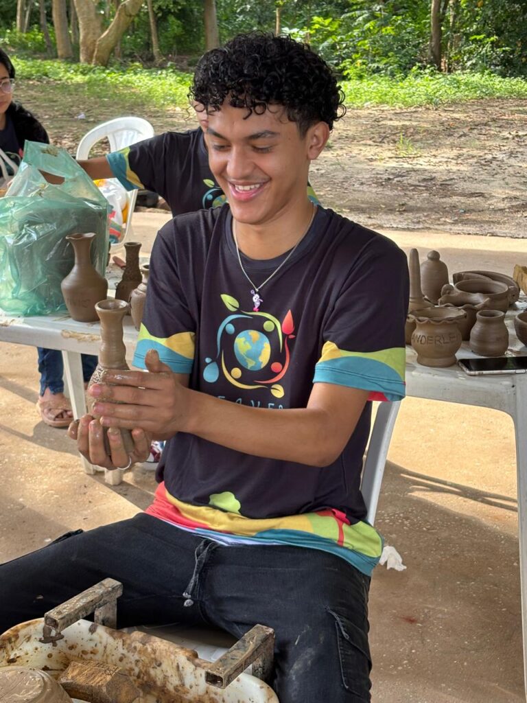 Já no segundo dia, como uma forma de resgatar a cultura local, o encontro foi feito as margens do Rio Poty, no Polo Cerâmico Artesanal do Poty Velho. Os jovens conheceram o local e realizaram, simultaneamente, as oficinas de modelagem de argila e a criação de uma carta de reivindicação sobre os problemas socioambientais dos territórios. Já durante o período da tarde, foi a vez da Dona Teresinha de Jesus repassar os seus ensinamentos na oficina de bijuterias feitas de cerâmica. Criando peças como pulseiras, cordões e brincos, tudo de forma artesanal.