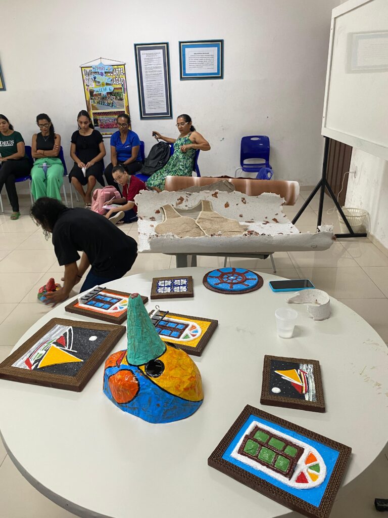 Ainda nesse dia, o professor, artesão e papeleiro Sidney conduziu uma oficina sobre reciclagem e reaproveitamento de papel. A atividade, realizada em parceria com o clube de protagonismo estudantil Reinventando o Amanhã, mostrou como a criatividade pode se aliar à sustentabilidade na transformação de resíduos em novos materiais, além de fortalecer o protagonismo juvenil na construção de práticas mais conscientes.